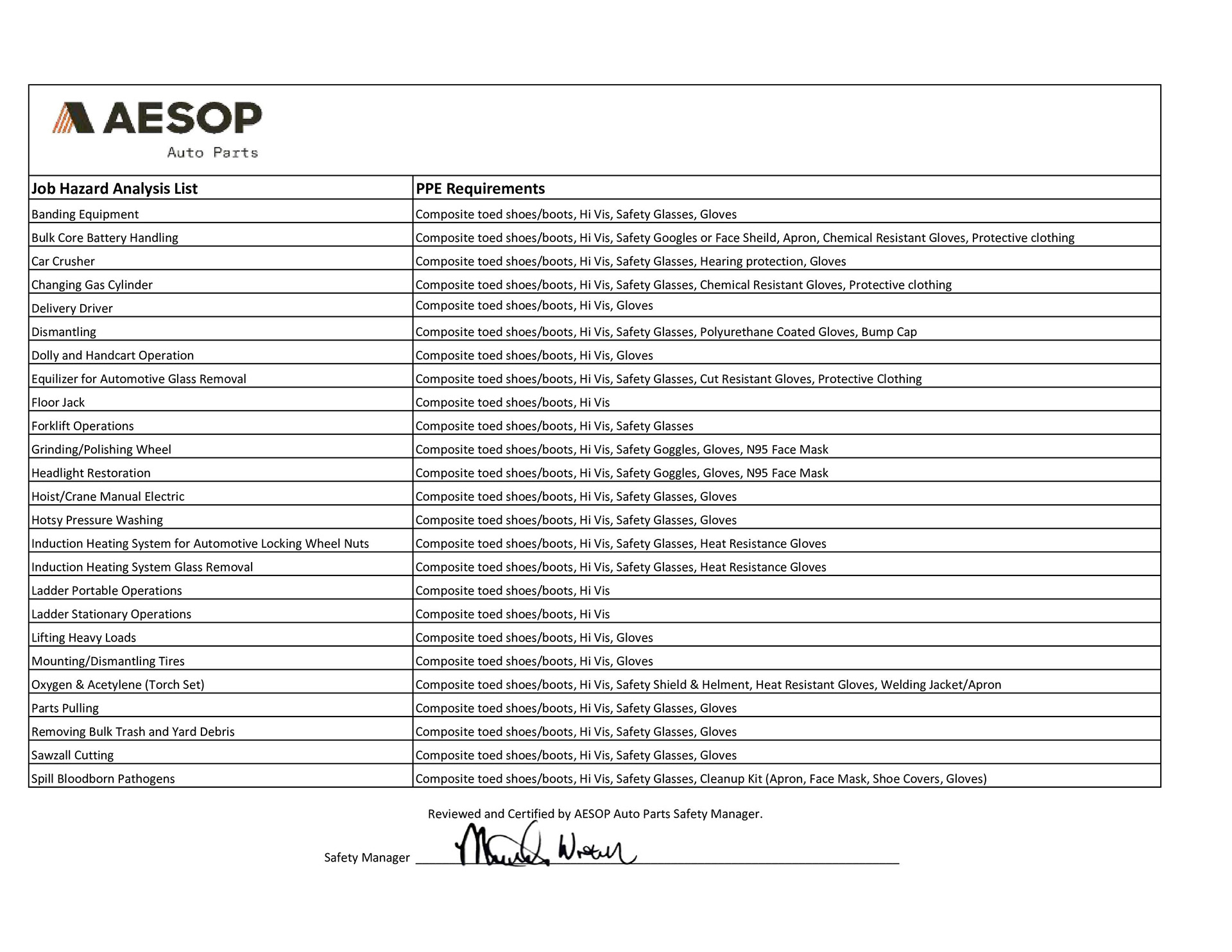 Aesop Auto Parts Safety Information